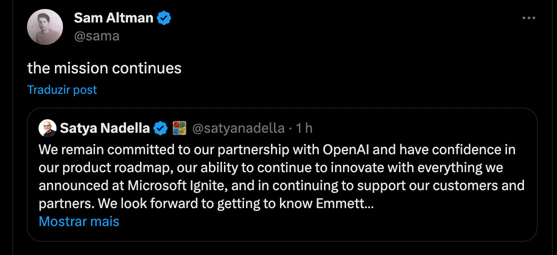 Também houve rumores de que executivos da OpenAI debatiam sobre o retorno de Sam e Greg para a OpenAI.